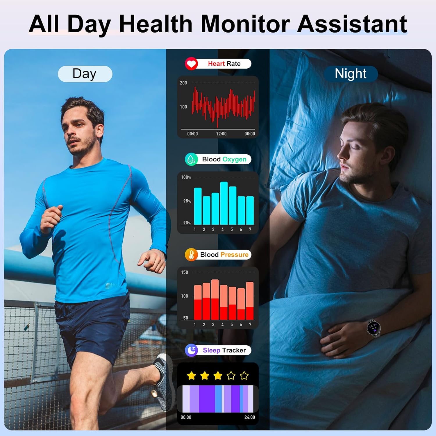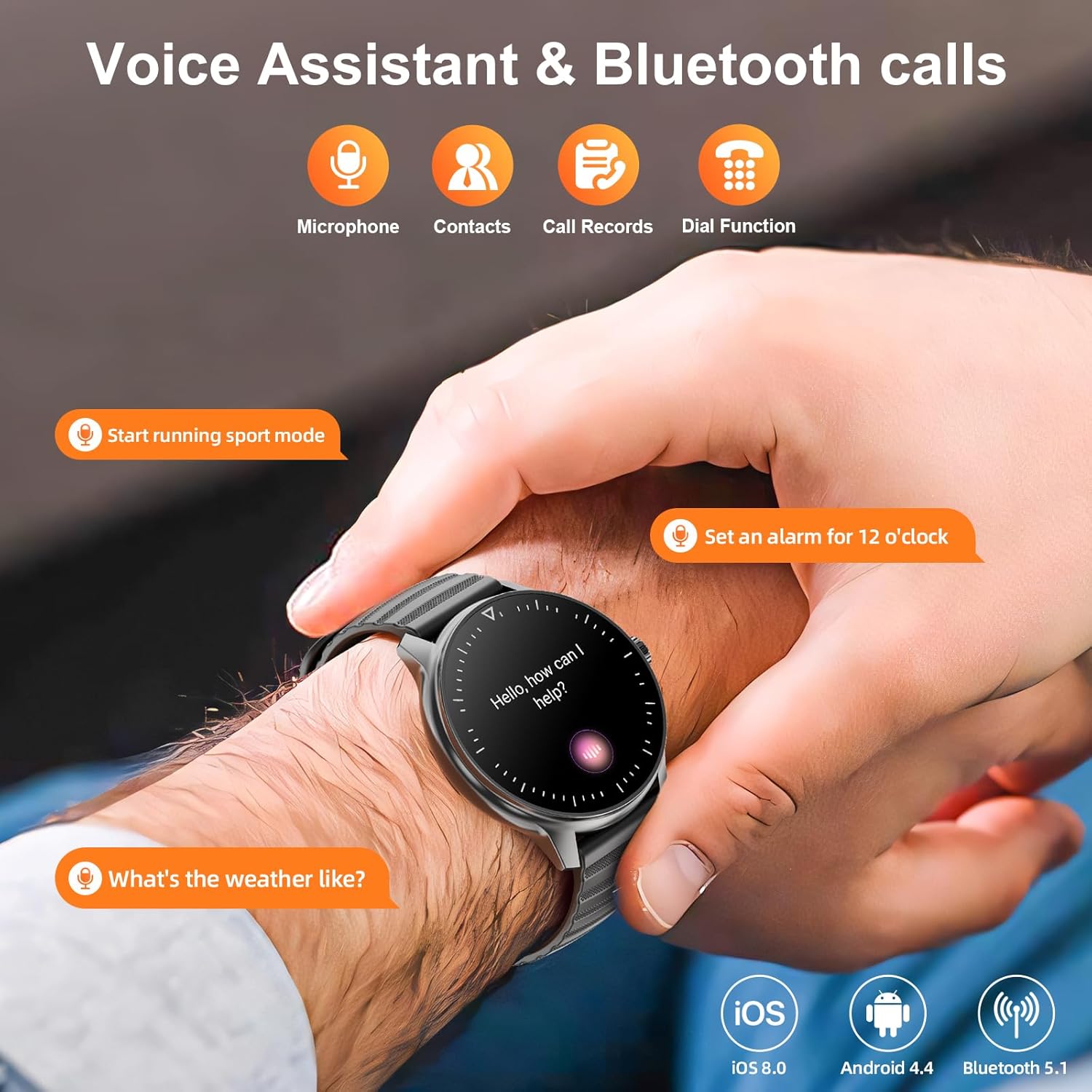 • 【Al Voice Control & Bluetooth Calling】Work with Al Voice assistant, you can ask questions, control music playback, check the weather, set alarms and timers, and more by speaking to your smartwatch. Adopting Bluetooth v5.1 call chip connecting Bluetooth, Intelligent noise reduction algorithm can eliminate background noise. You can also answer/make clear calls directly from your smart watches(The Watch Can Not Send Messages, or Text Back, Bluetooth Distance 8-10 meters).